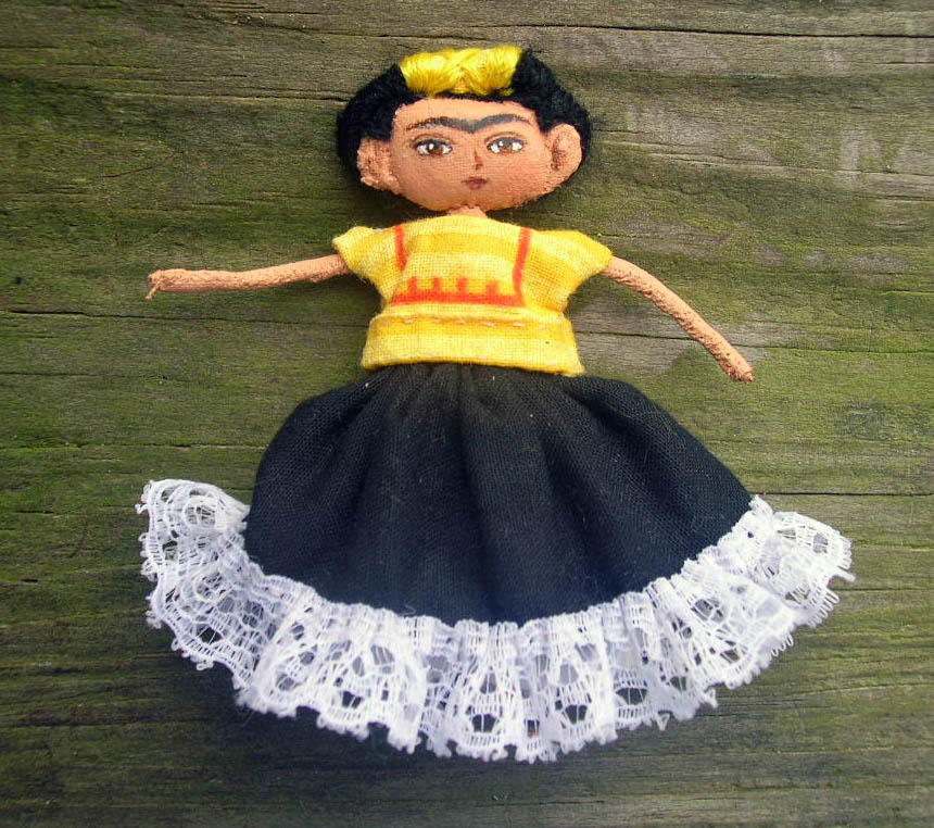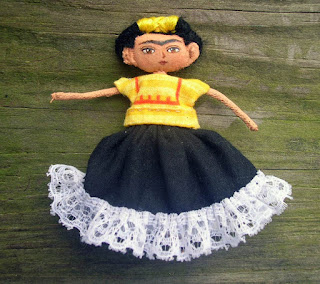 La otra Frida iba a llevar una blusa amarilla con un motivo en rojo y falda negra con encaje. Esta muneca ya tenia pelo! Su cabello fue colocado con agujas de afelpar fibra por fibra.