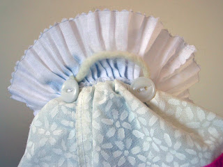 I got to a point where each of the five dolls I made started needing different accessories to become unique. The doll that got to be the Tehuana was almost entirely dress in white. I got her skirt, underskirt, and blouse ready, next step was to get the head-dress. I made it from cream color linen with white hand painted flowers, hand painted fabric, and a muslin ruffle.