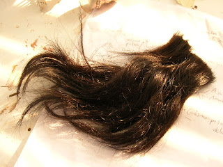 The next step is putting some hair on her head, she is supposed to have braids. I had in storage hair from the last time my friend and haircutter Israel came to cut it, by the way, he made an excellent job.